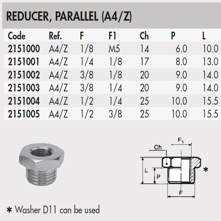 2151001 Fitting 1/4inch x 1/8inch Reducer, Parallel (A4/Z)