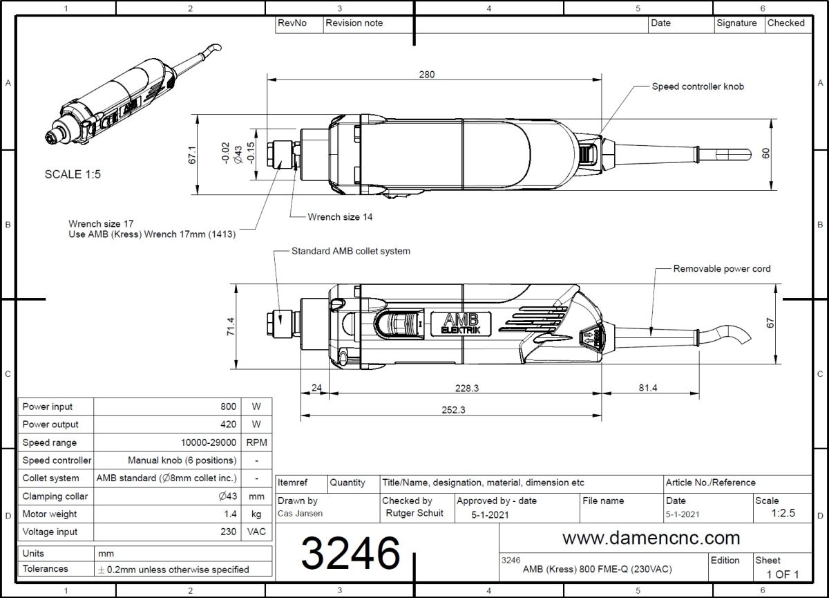 Standard AMB Milling motor. It has a higher speed range than the 1050 FME-1: between 10.000rpm and 29.000rpm, but less power. Compared to the 800 FME, it has a removable quick-action lock cable.