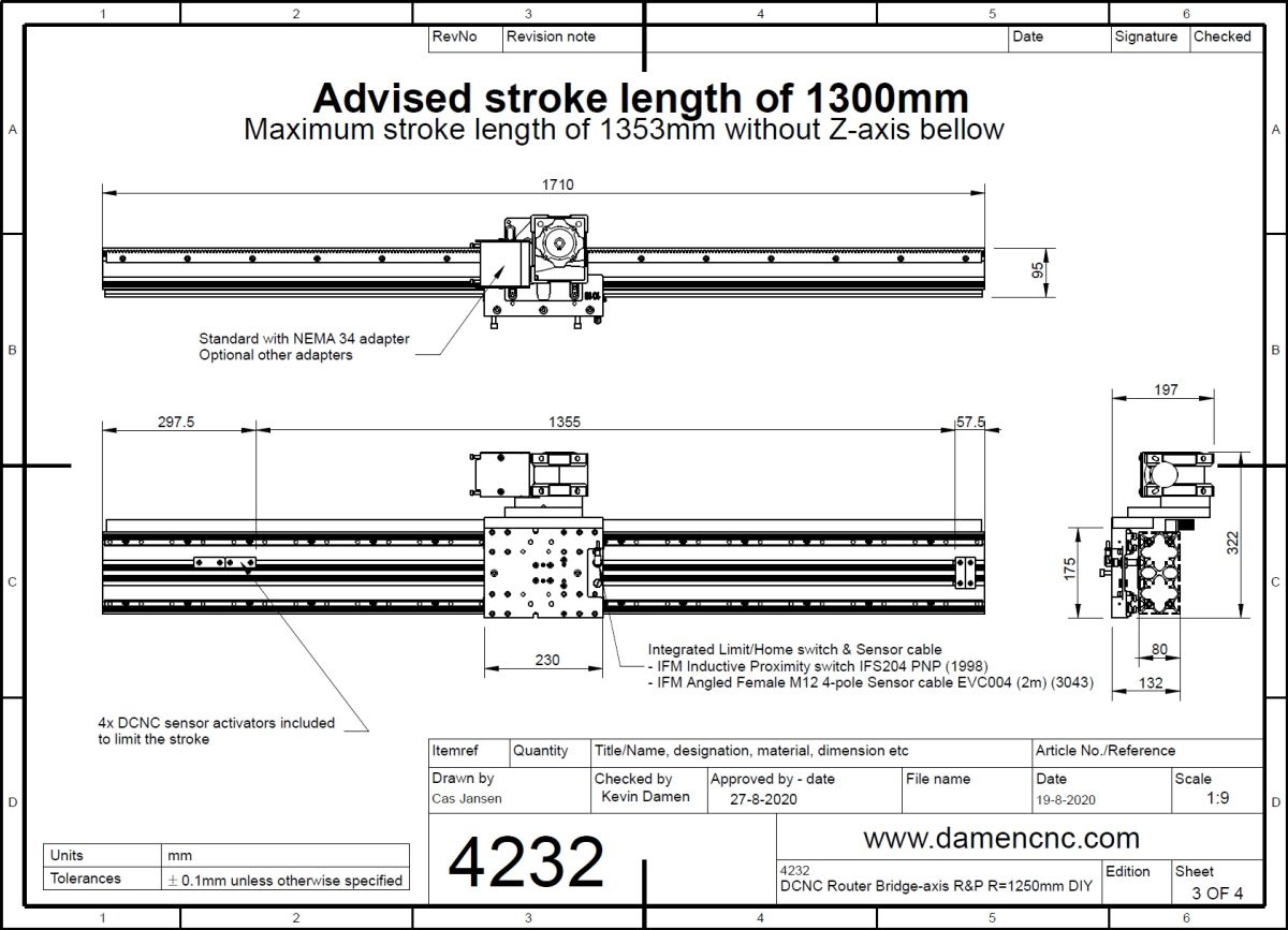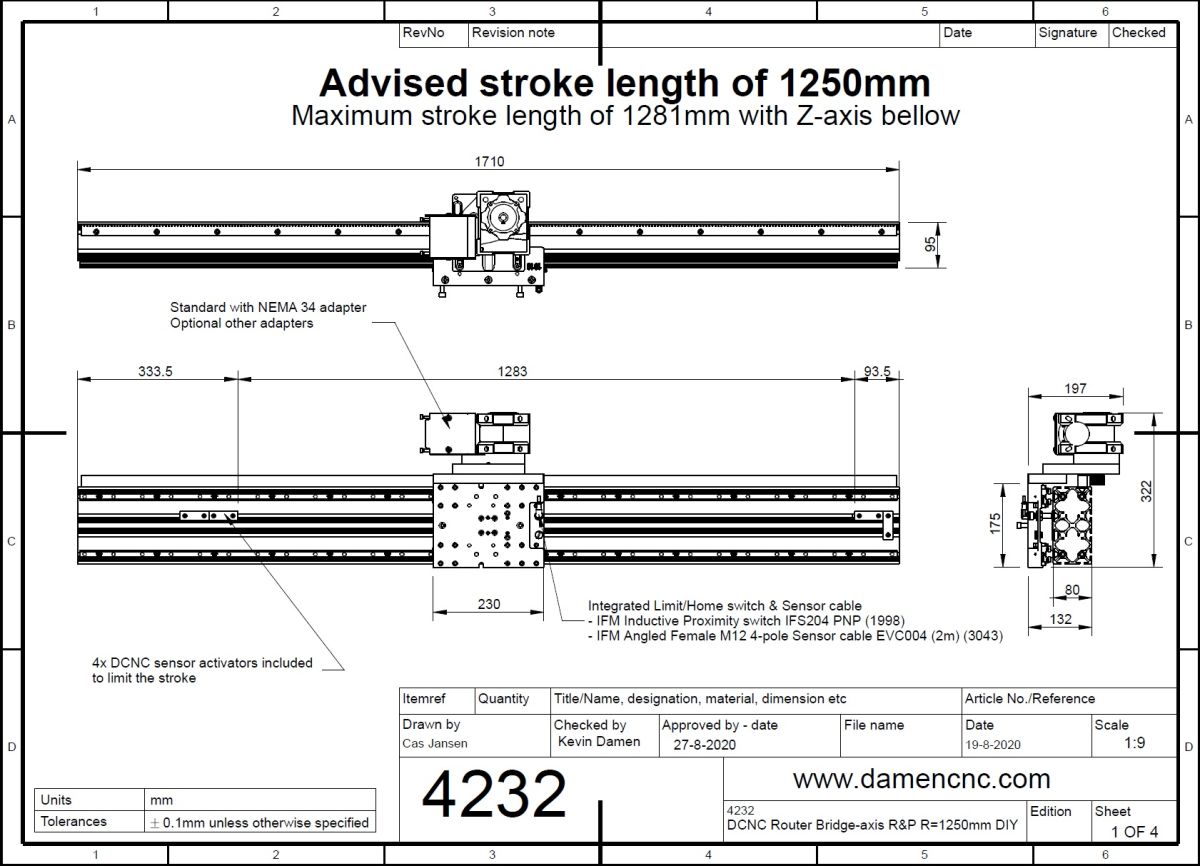 - Bridge-axis Range = 1281mm net; range separate module = 1353mm net