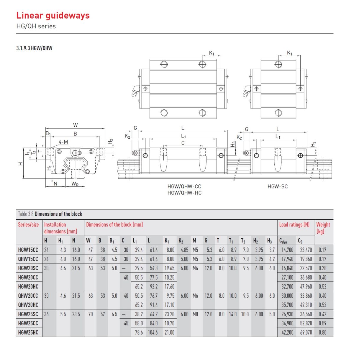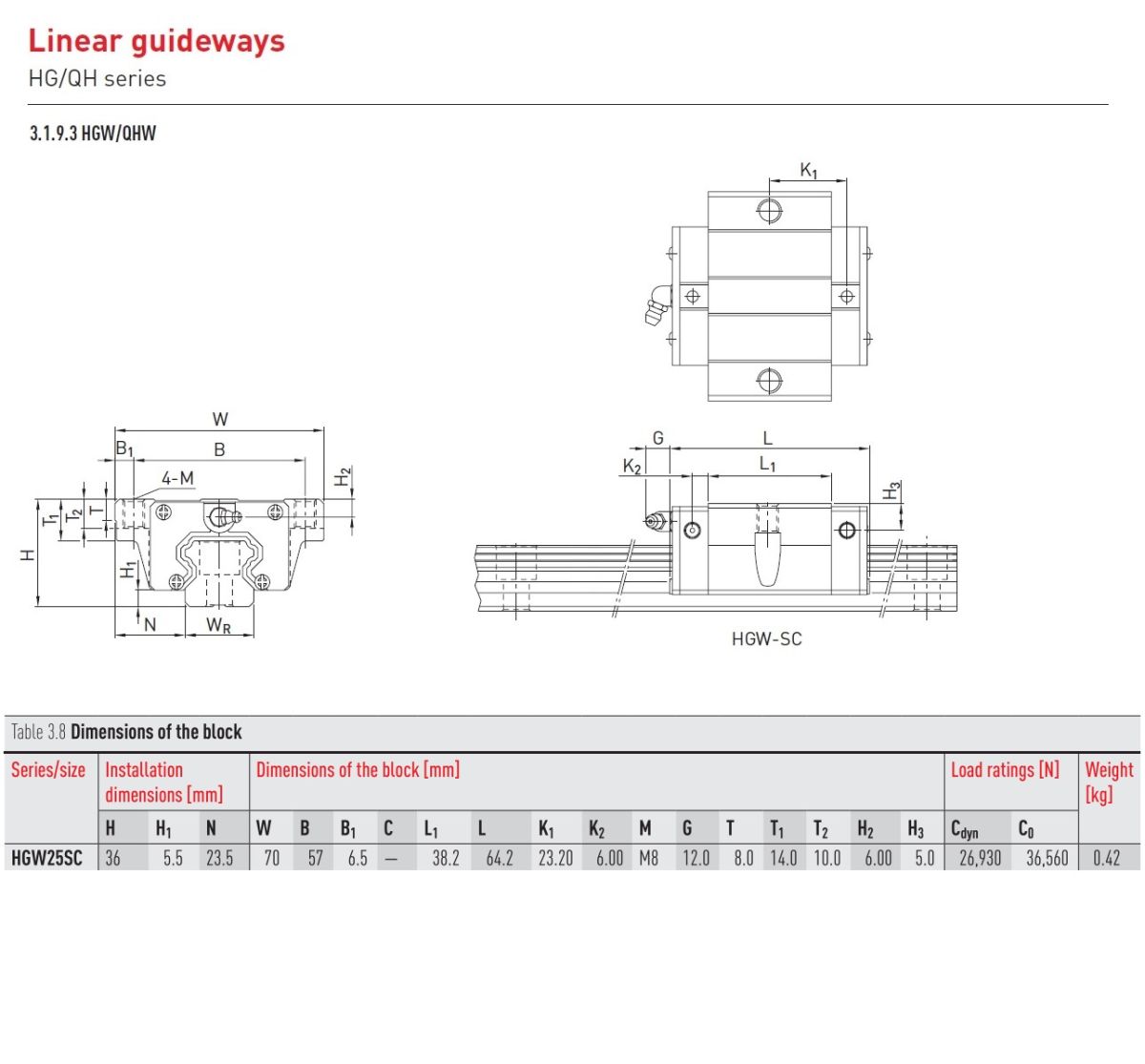 The HGW-25-SC-Z0-H Hiwin block is manufactured in quality class H - high and has a light preload Z0 (0-0.02 C), which allows precise and rigid guidance along the linear guide.