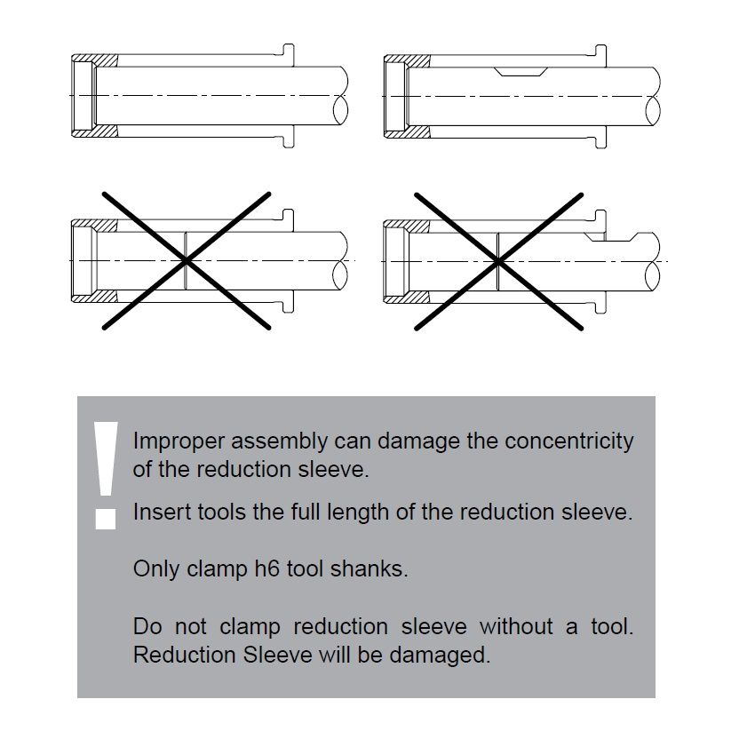 The reduction sleeves are designed to fit with the ETP Toolholders. They are specially suited for high precision clamping of cylindrical tool shanks per DIN 6335 form HA, HB and HE, as well as tool shanks per DIN 1835 form B, C, D and E. The special design of the reduction sleeves allows an efficient use of coolant through cutting tools.