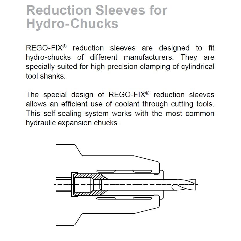 The reduction sleeves are designed to fit with the ETP Toolholders. They are specially suited for high precision clamping of cylindrical tool shanks per DIN 6335 form HA, HB and HE, as well as tool shanks per DIN 1835 form B, C, D and E. The special design of the reduction sleeves allows an efficient use of coolant through cutting tools.