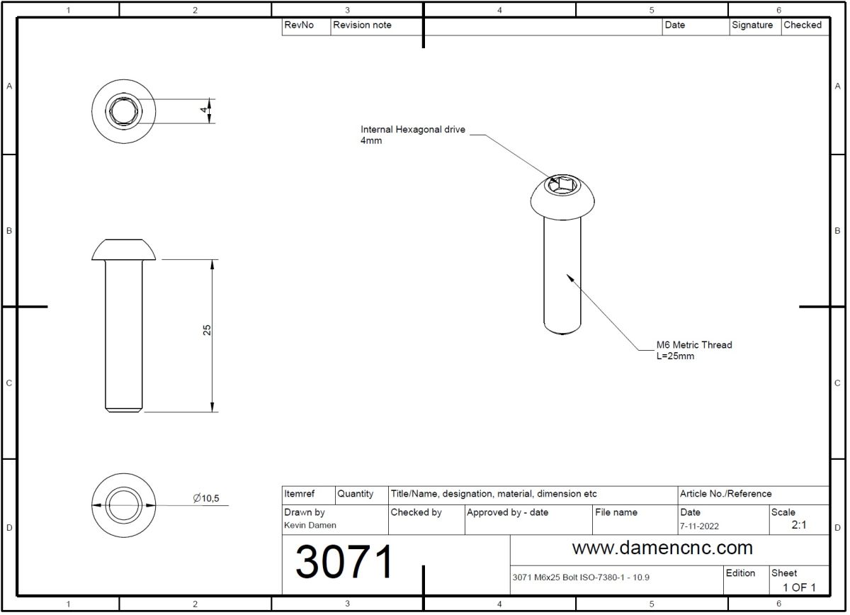 | 3071-3 M6x25 Bolt ISO-7380-1 - 10.9 2D Dimensions |