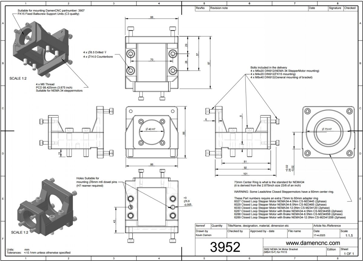 - 4 x M6x20 DIN912 bolts included for mounting the NEMA 34 steppermotor