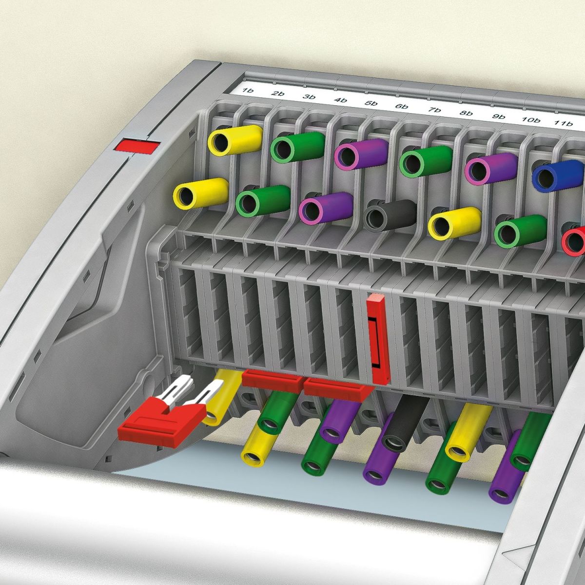 The push-in connection terminals are characterised by the system features of the CLIPLINE complete system as well as the simple and tool-free connection of conductors with ferrules or solid conductors. The compact design and the front connections enable connections in the smallest of spaces. This article is also compatible with the RIFLine relay system from Phoenix Contact. These blue plug-in bridges are usually used on the bottom of the relay to connect a common 0VDC between a whole series of relays. It is also possible to use this common connection on the relay as a +24VDC. In that case, we always use the red instead of the blue plug-in bridge. We also have these in our product range, the 5-way has article number 4959