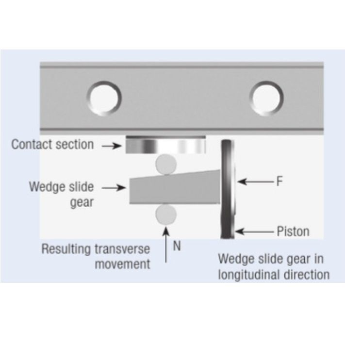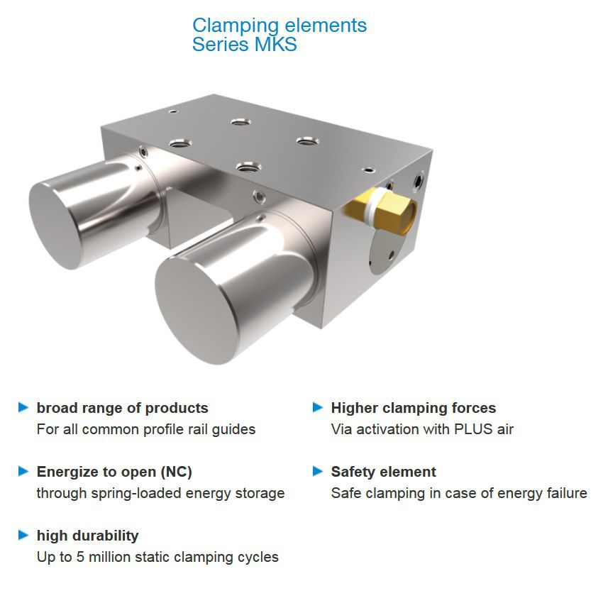 Pneumatic Clamping Element which is compatible with the HIWIN HGR series rails and carriages. The brake is spring loaded. Which means pneumatics need to be added/present to release the brake. This is normally done with a 5/2 Valve. This MKS type is made to hold a carriage in place, it is not suitable for active braking. In case you need this type, consult us info@damencnc.com for more information. There are models which are suitable for active braking.