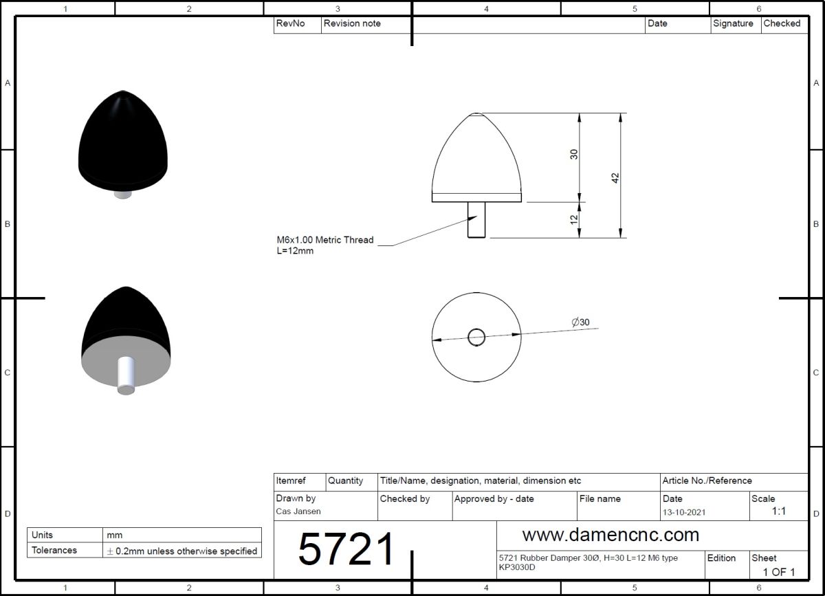 5721-1 Rubber Damper 30Ø, H=30 L=12 M6 type KP3030D STEP214 |