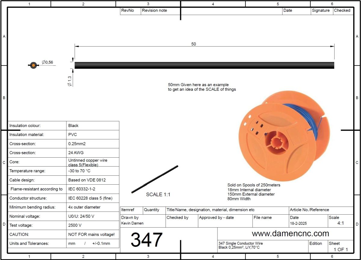 Lapp LiY 70° installation wire, nom. conductor cross-section 0.25mm², nom. conductor diameter 0.56mm, conductor composition class 5 = flexible, conductor material copper, conductor surface bare, core insulation polyvinyl chloride (PVC), core colour black, outer diameter 1.3mm, processing temperature -30 - +70°C,