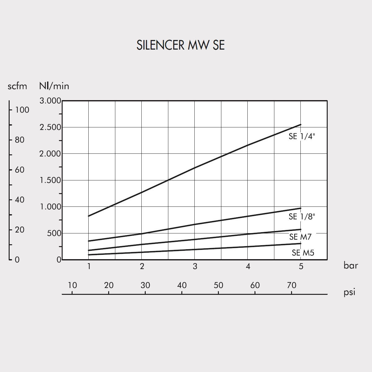 - Noise reduction: -28Db (Reduction of the noise that you obtain mounting a silencer on a compressed air exhaust, measured by feeding at 5 bar, at a distance of 1 m with 45° angle to the axis of the silencer.