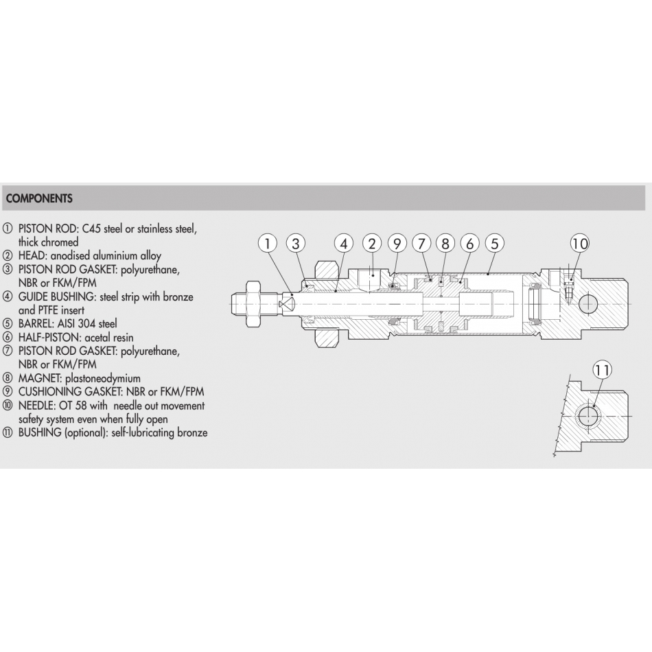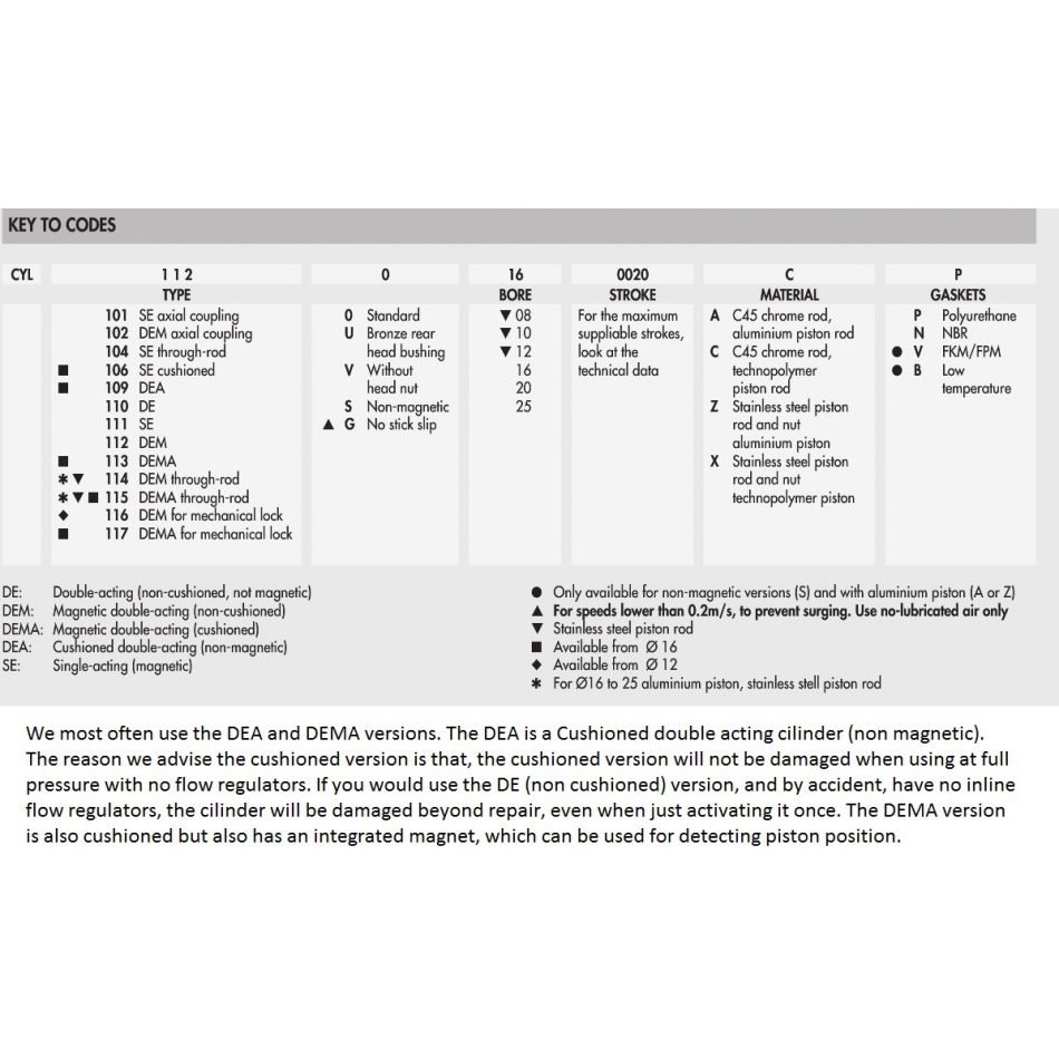 Wij gebruiken meestal de DEA en DEMA versies. De DEA is een dubbelwerkende cilinder met kussens (niet magnetisch). De reden dat wij deze gedempte versie advisren, is omdat deze versie niet beschadigd raakt bij gebruik bij volledige druk, zonder flowregelaars. Als u de DE versie (niet gedempte versie) zou gebruiken en u heeft per ongeluk geen inline stroom regulaars, dan zal de cilinder onherstelbaar beschadigen, zelfs wanneer u hem slechts eenmaal heeft geactiveerd. De DEMA versie is ook gedempt, maar deze heeft ook een geintegreerde magneet, die kan worden gebruikt voor het detecteren van de zuigerpositie.