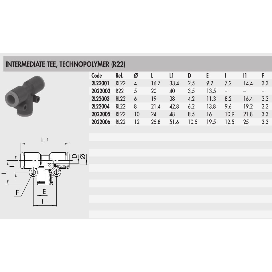 2022006 Push-in fitting Ø12mm, T, Intermediate, Technopolymer (R22)