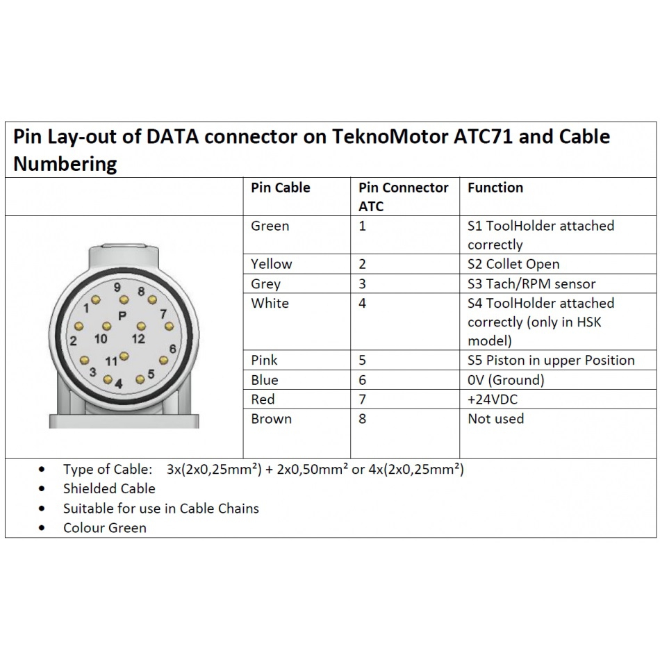Op de TeknoMotor ATC zitten M23 connectoren van hoogwaardige kwaliteit. The M23 connectoren hebben krimp contacten waarvoor speciaal gereedschap nodig is. Zelfs het meest basis krimp gereedschap kost al rond de 450 euro. Wij gaan er van uit dan onze klanten dit gereedschap niet hebben en daarom maken wij de bekabeling. Het hebben geinvesteerd in het gereedschap, zodat wij de kabels op lengte kunnen maken. Standaard zit er een M23 connector op de ATC, en open end bedrading aan de andere kant,er van uit gaande dat er bedraad wordt aan de CNC & VFD. Als u 2 connectoren nodig heeft en een chassis contra connector, kunt u contact met ons opnemen. Wij kunnen deze voor u op maat maken.