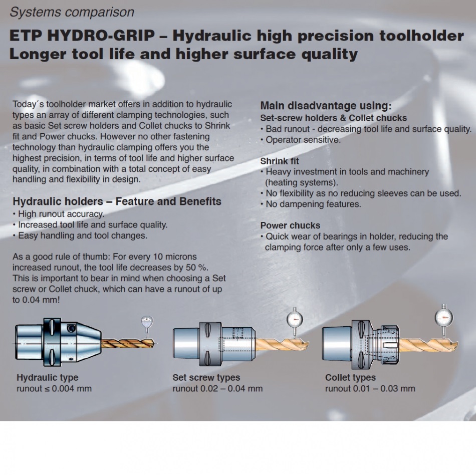 De TeknoMotor QTC wordt vaak gebruikt in robotfreesprojecten. Voor robotfrezen zijn vaak lange gereedschappen nodig om het product / object correct te kunnen bereiken. Het probleem met lang gereedschap is onbalans, wat schade aan lagers kan veroorzaken. Deze ETP-potloodrouters zijn uitgebalanceerd volgens de hoogste normen en hebben een zeer lage rondloop. ETP HYDRO-GRIP PENCIL is met zijn extreem slanke ontwerp een van de meest veelzijdige houders op de markt. Een uitgebreide reeks standaardafmetingen en lengtes optimaliseren uw productiviteit bij het bewerken van diepe holtes en complexe componenten. ETP HYDRO-GRIP PENCIL kan ook worden gemaakt volgens uw specifieke maatlijnvereisten, met behulp van onze speciale ontwerpen mogelijkheid.
