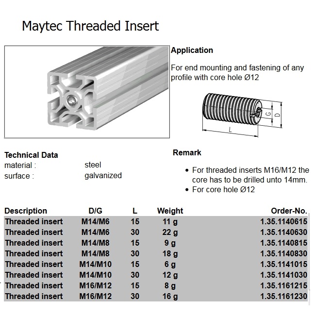 Werken met het Maytec profiel systeem is net iets anders dan ITEM of BOSCH. De geexturdeerde gaten zijn namelijk voorbereid op m14draad. De draad-adapters die we hier aanbieden zijn er om een verloop van m14 naar een kleiner draad soort te maken. Meest voorkomende type is van m14 naar m8, maar ook andere maten zijn verkrijgbaar.