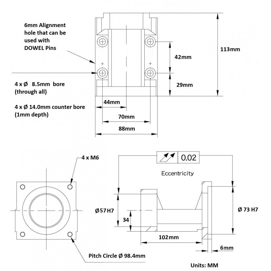 Motorsteun gemaakt van staal. Deze heeft een NEMA34 flens die compatible is met de meeste NEMA34 stappenmotor of servo motoren. De centreer rand van 73mmH7 wil nog weleens verschillen, bij Leadshine is deze bijvoorbeeld 60mmh7. De motorsteun heeft een referentie oppervlak aan de onderkant, ook voorzien van twee 6mm paspen gaten. Deze kunnen worden gebruikt om de perfecte uitlijning te krijgen bij het terugplaatsen op een machineframe. De uitlijning tussen het lager en de flens is <0,02mm omdat alle bewerkingen in 1 opspanning worden gedaan. Bij het bouwen van een CNC machine of een andere speciaal machine is dit een intressant onderdeel om te gebruiken, omdat het veel tijd bespaart, die normaal verloren gaat aan het maken van een custom beugel, die dan meestal veel minder precies is dan de deze. Dit lagerblok is compatibel met het BF20 zwevende lagerblok (zelfde hoogte tov van het referentie oppervlak). Meestal wordt dit lagerblok gebruikt in combinatie met 32mm diameter kogelomloop spindels.