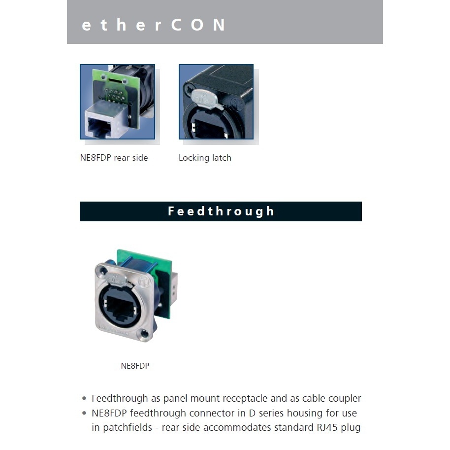 RJ45 feedthrough receptacle, D-vormige metalen flens met vergrendeling, inclusief schroeven om te monteren. De etherCON Serie is een robuust en vergrendelbaar RJ45 connector systeem, geoptimalisserd voor pro audio, video en beliichting netwerk applicaties. De chassis connectoren zijn zo gevormd dat ze in gestandariseerde panelen van de entertainment industrie passen. De D-Serie biedt het meest robuuste design van de etherCON serie en is geschikt voor de installatiemarkt. Let op! Werkt niet met een CAT6 kabel connector NE8MC6-MO en NKE6S* kabels.