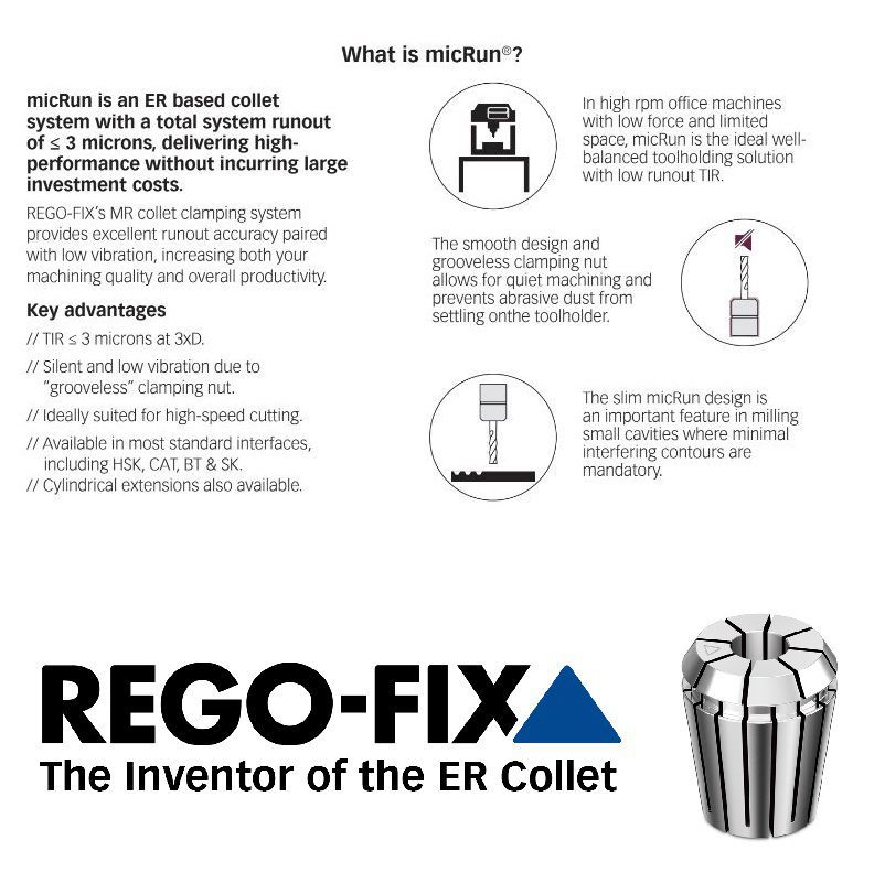 - Rondloopnauwkeurigheid <=3µm (totale systeemrondloopafwijking bij gebruik van een micRun gereedschapshouder)