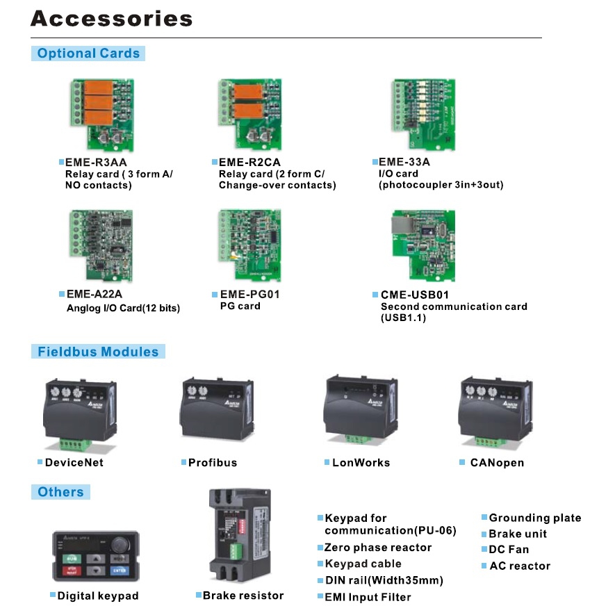 Sensorloze Vector AC Micro Drive. De VFD-E serie vertegenwoordigt Delta Electronics met een laag pk, constante koppel en een IP20 Drive. Modulair in het ontwerp met flexibele uitbreidingskaarten en een ingebouwde PLC functie, de E drive biedt de mogelijkheid om simpele Ladder Logic programma' s te schrijven en uit te voeren. Deze state-of-the-art serie voldoet aan een hele reeks toepassingsvereisten.
