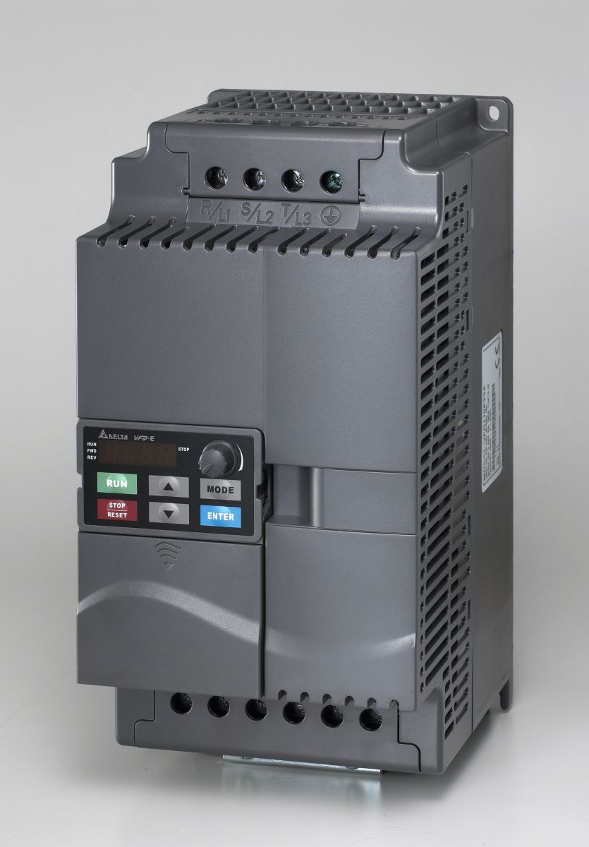 Sensorloze Vector AC Micro Drive. De VFD-E serie vertegenwoordigt Delta Electronics met een laag pk, constante koppel en een IP20 Drive. Modulair in het ontwerp met flexibele uitbreidingskaarten en een ingebouwde PLC functie, de E drive biedt de mogelijkheid om simpele Ladder Logic programma' s te schrijven en uit te voeren. Deze state-of-the-art serie voldoet aan een hele reeks toepassingsvereisten.