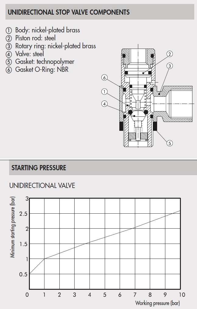 What we offer here is the unidirectional stop valve. This halts the flow only in one direction. This can be useful for pistons working against gravity. For safety reasons often you do not want the load to fall. But also for safety reasons most often, you do not want the cylinder, to be stuck in both direction, as someone could be trapped below load. With a uni-directional version this problem is solved. Since the load cant fall, but it can be lifted. Please keep in mind that each application requires its own risk assessment.